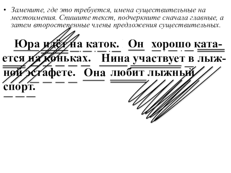 Замените, где это требуется, имена существительные на местоимения. Спишите текст, подчеркните сначала главные, а затем второстепенные члены предложения существительных.