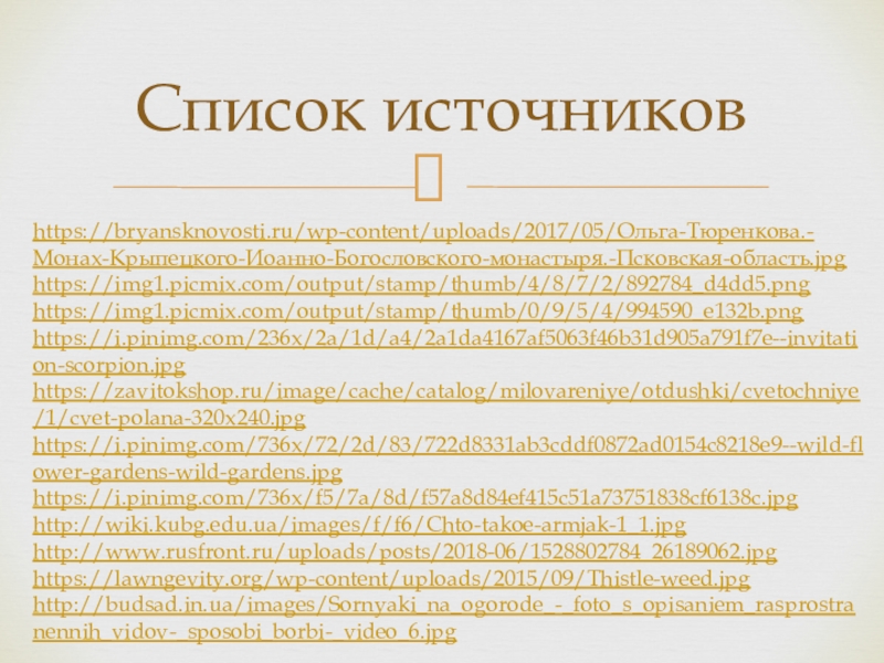 Список источниковhttps://bryansknovosti.ru/wp-content/uploads/2017/05/Ольга-Тюренкова.-Монах-Крыпецкого-Иоанно-Богословского-монастыря.-Псковская-область.jpghttps://img1.picmix.com/output/stamp/thumb/4/8/7/2/892784_d4dd5.pnghttps://img1.picmix.com/output/stamp/thumb/0/9/5/4/994590_e132b.pnghttps://i.pinimg.com/236x/2a/1d/a4/2a1da4167af5063f46b31d905a791f7e--invitation-scorpion.jpghttps://zavitokshop.ru/image/cache/catalog/milovareniye/otdushki/cvetochniye/1/cvet-polana-320x240.jpghttps://i.pinimg.com/736x/72/2d/83/722d8331ab3cddf0872ad0154c8218e9--wild-flower-gardens-wild-gardens.jpghttps://i.pinimg.com/736x/f5/7a/8d/f57a8d84ef415c51a73751838cf6138c.jpghttp://wiki.kubg.edu.ua/images/f/f6/Chto-takoe-armjak-1_1.jpghttp://www.rusfront.ru/uploads/posts/2018-06/1528802784_26189062.jpghttps://lawngevity.org/wp-content/uploads/2015/09/Thistle-weed.jpghttp://budsad.in.ua/images/Sornyaki_na_ogorode_-_foto_s_opisaniem_rasprostranennih_vidov-_sposobi_borbi-_video_6.jpg