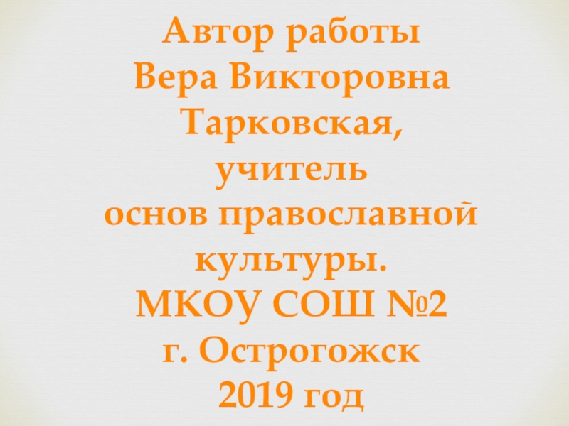 Автор работы Вера Викторовна Тарковская, учитель основ православной культуры. МКОУ СОШ №2 г. Острогожск2019 год