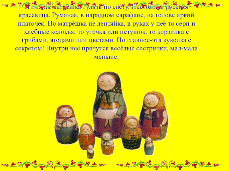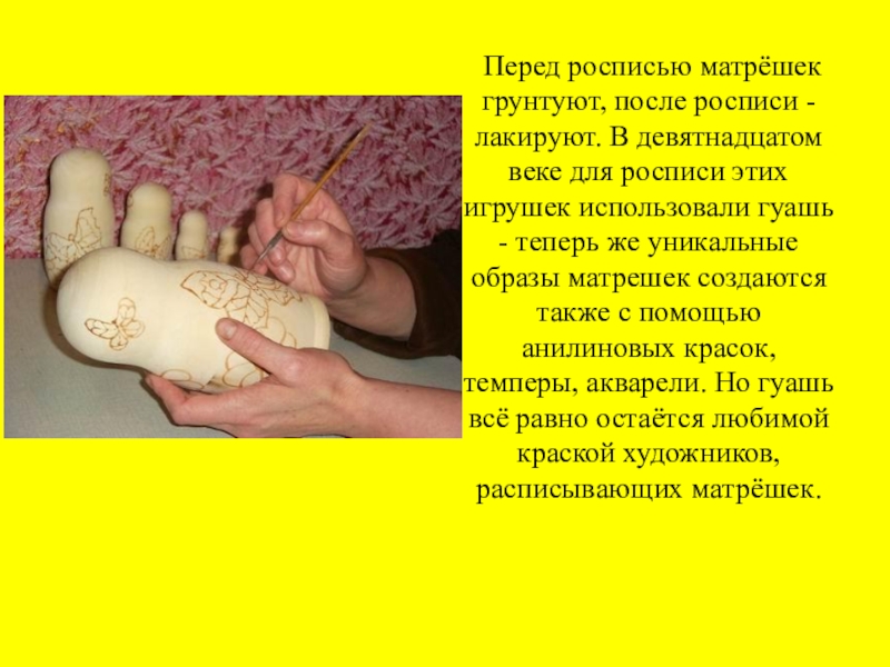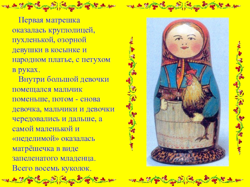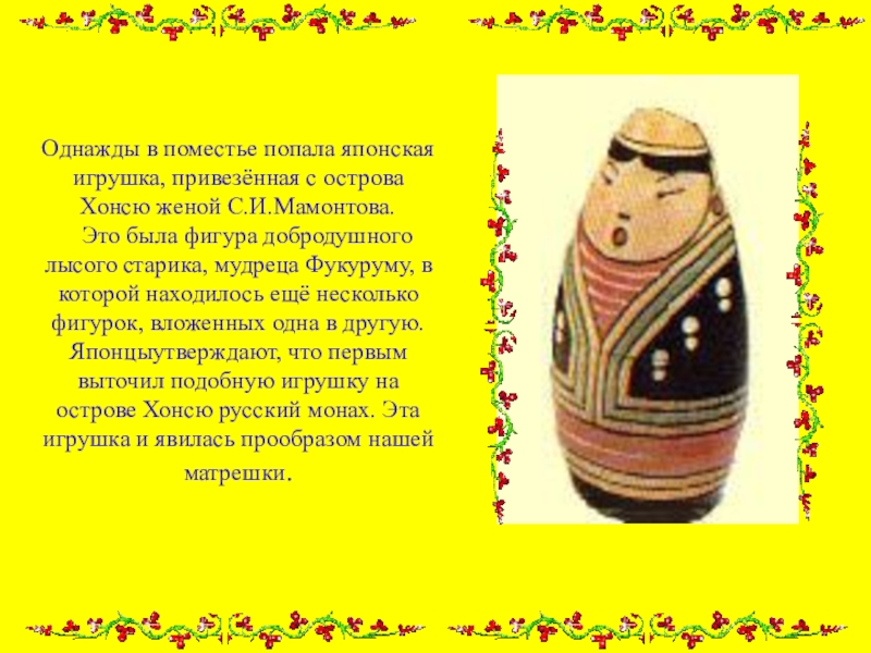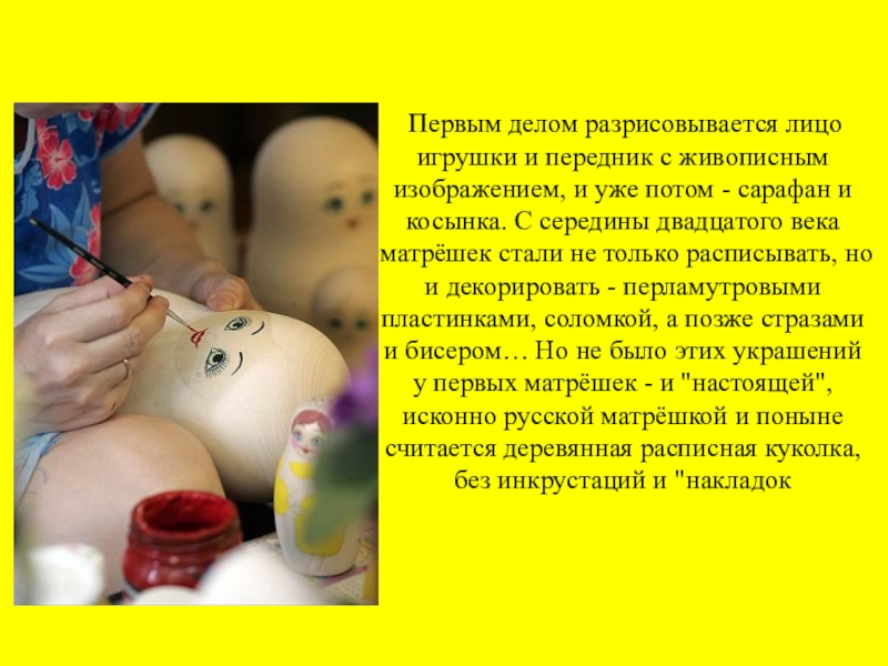 Эскиз для ее росписи создал художник Сергей Малютин, самолично матрёшку и расписавший.
