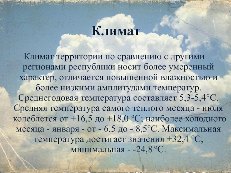 Климат территории по сравнению с другими регионами республики носит более умеренный