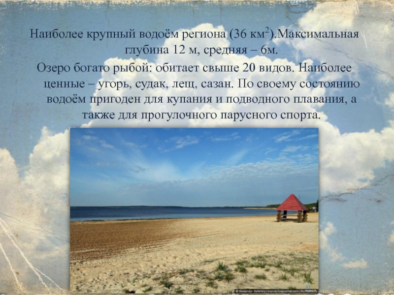 Слайд 14Наиболее крупный водоём региона (36 км2).Максимальная глубина 12 м, средняя –