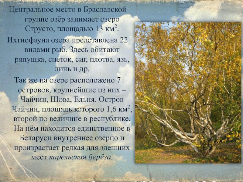 Слайд 18Центральное место в Браславской группе озёр занимает озеро Струсто, площадью 13