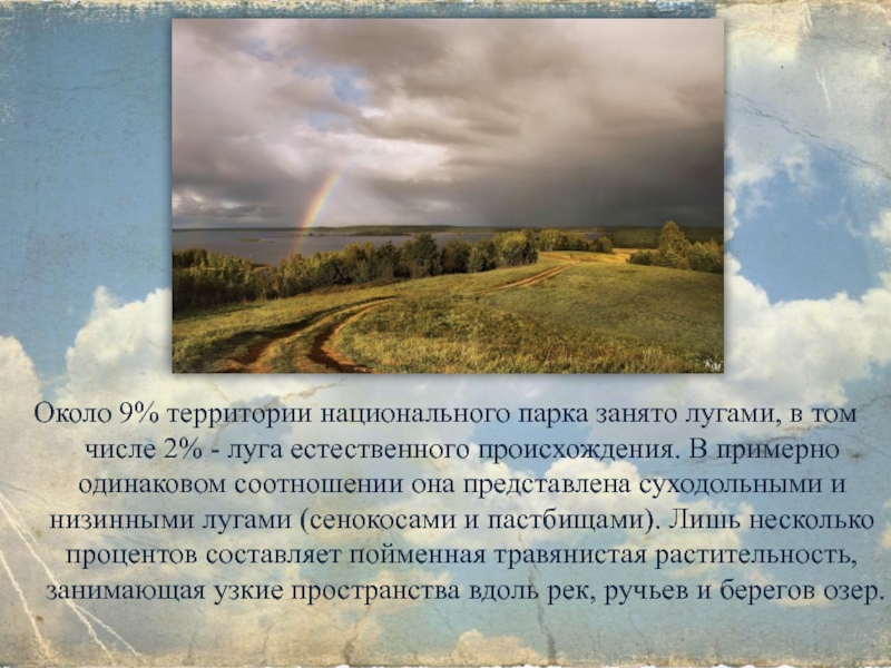 Слайд 27Около 9% территории национального парка занято лугами, в том числе 2%