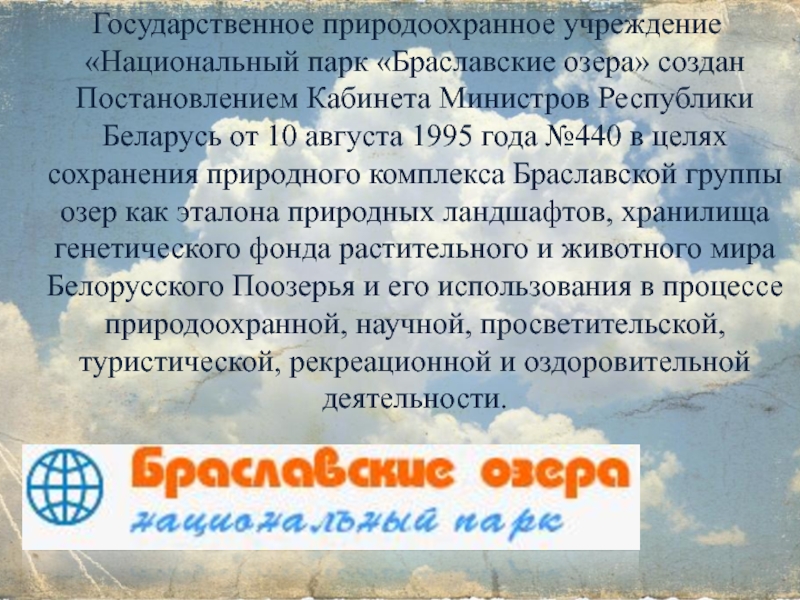 Слайд 7 Государственное природоохранное учреждение «Национальный парк «Браславские озера» создан Постановлением Кабинета