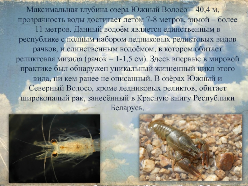 Слайд 20Максимальная глубина озера Южный Волосо – 40,4 м, прозрачность воды достигает