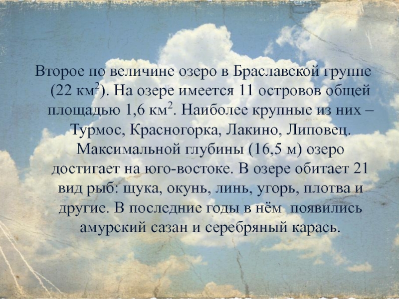 Слайд 16Второе по величине озеро в Браславской группе (22 км2). На озере
