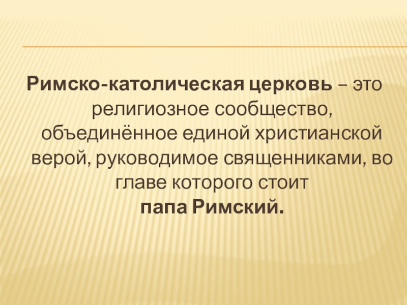Римско-католическая церковь – это религиозное сообщество, объединённое единой христианской верой, руководимое священниками, во главе которого стоит папа Римский.