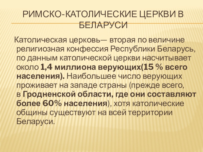 Римско-католические церкви в беларуси  Католическая церковь— вторая по величине религиозная конфессия Республики Беларусь, по данным католической