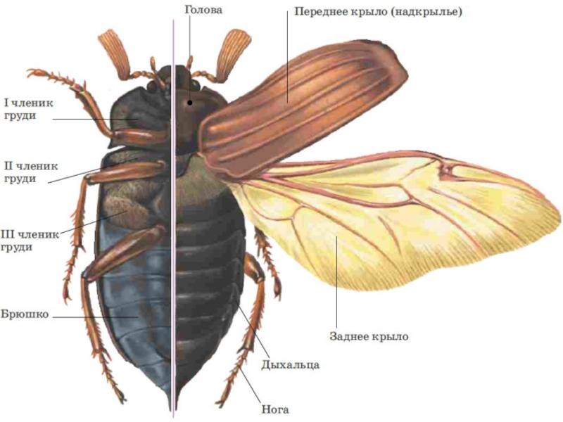 Слайд 8Тело майского жука, как и у остальных насекомых, состоит из трех