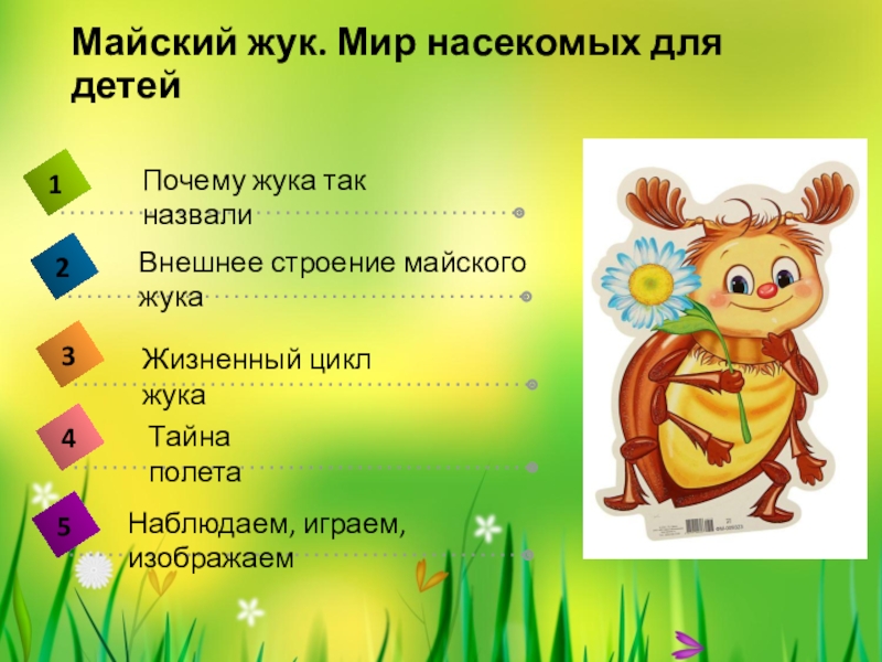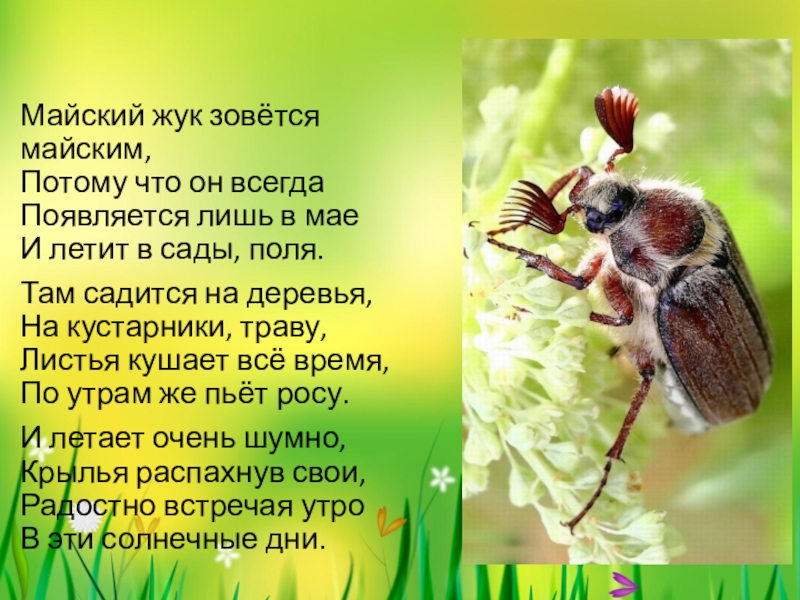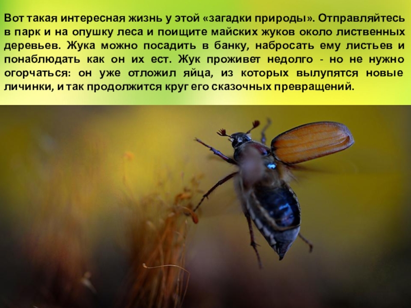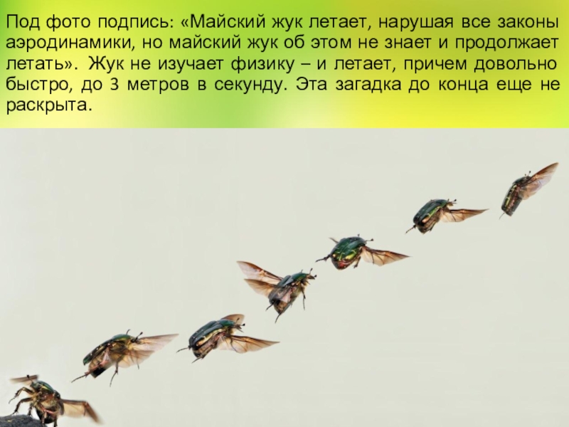 Слайд 25Под фото подпись: «Майский жук летает, нарушая все законы аэродинамики, но