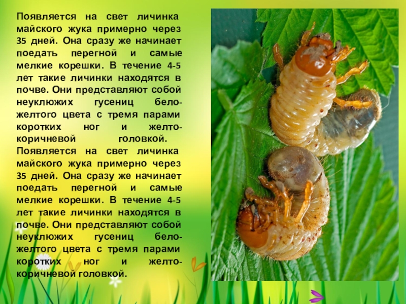 Слайд 18Появляется на свет личинка майского жука примерно через 35 дней. Она
