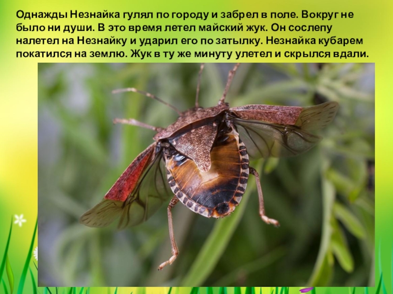 было ни души. В это время летел майский жук. Он сослепу налетел на Незнайку и ударил его по затылку. Незнайка кубарем покатился на землю. Жук в ту же минуту улетел и скрылся вдали.