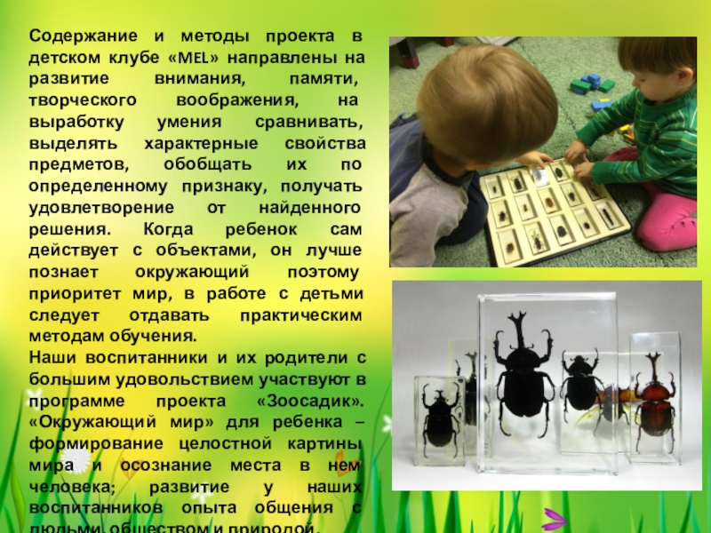 Слайд 3Содержание и методы проекта в детском клубе «MEL» направлены на развитие