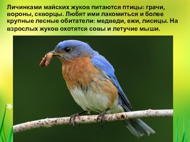 Слайд 14Личинками майских жуков питаются птицы: грачи, вороны, скворцы. Любят ими лакомиться