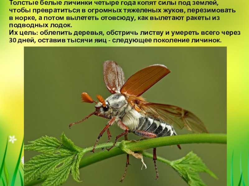 Слайд 20Толстые белые личинки четыре года копят силы под землей, чтобы превратиться