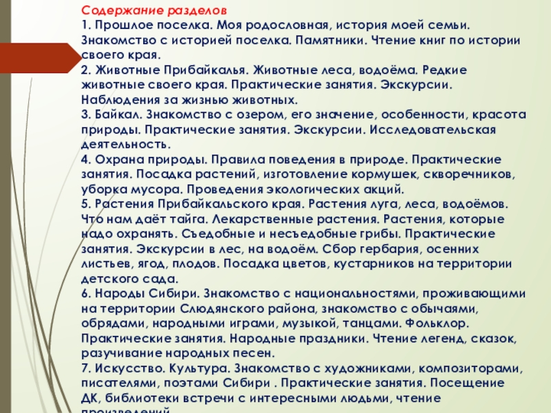 6. Народы Сибири. Знакомство с национальностями, проживающими на территории Слюдянского района, знакомство с обычаями, обрядами, народными играми, музыкой, танцами. Фольклор. Практические занятия. Народные праздники. Чтение легенд, сказок, разучивание народных песен.