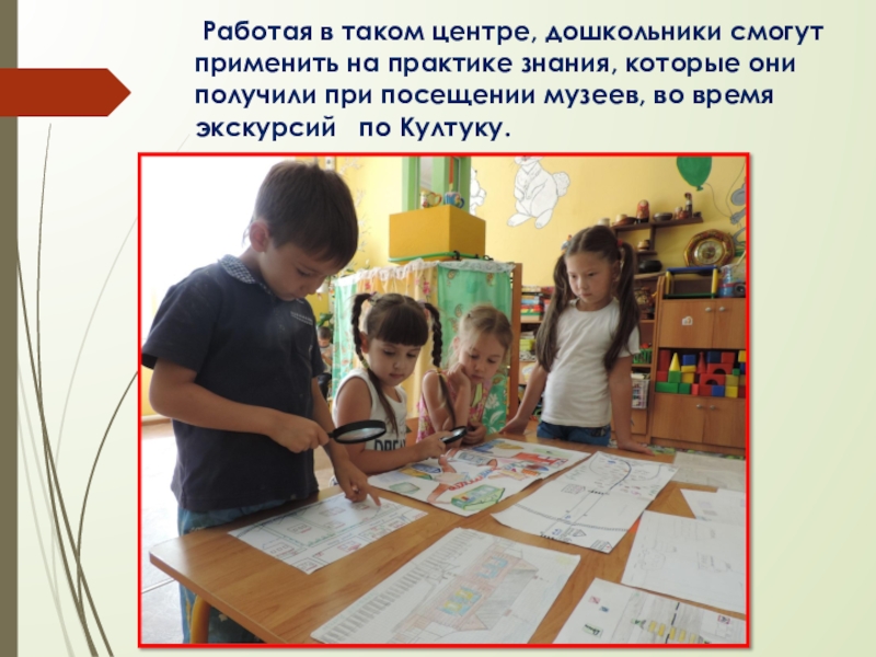 Слайд 9 Работая в таком центре, дошкольники смогут применить на практике знания,