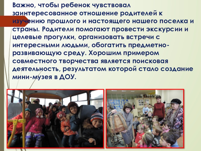 настоящего нашего поселка и страны. Родители помогают провести экскурсии и целевые прогулки, организовать встречи с интересными людьми, обогатить предметно-развивающую среду. Хорошим примером совместного творчества является поисковая деятельность, результатом которой стало создание мини-музея в ДОУ.