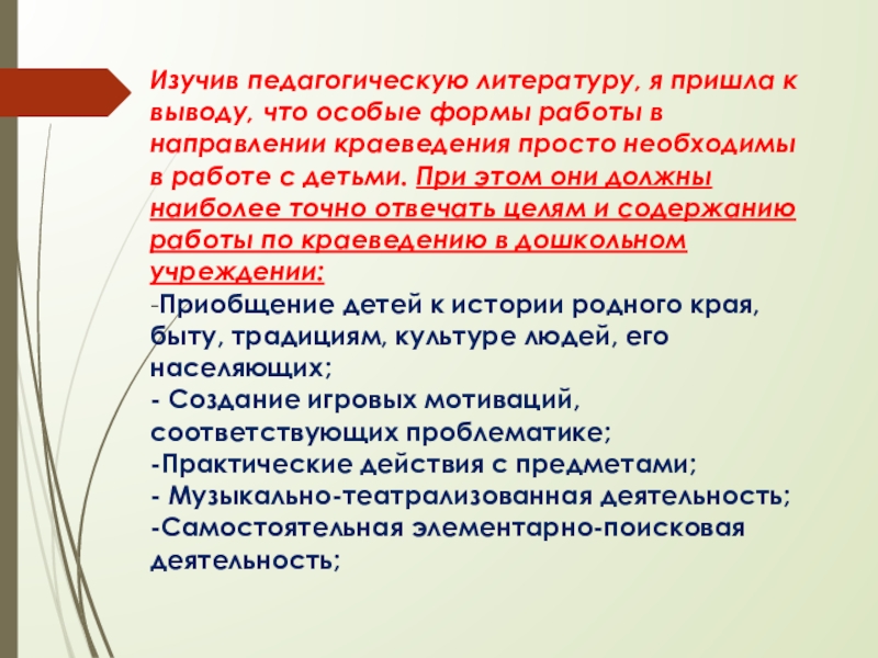 Слайд 6Изучив педагогическую литературу, я пришла к выводу, что особые формы работы