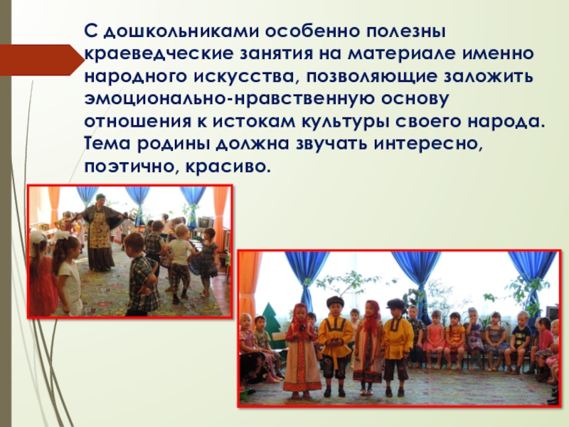 Слайд 16Формирование у детей любви к родному краю невозможно без приобщения их