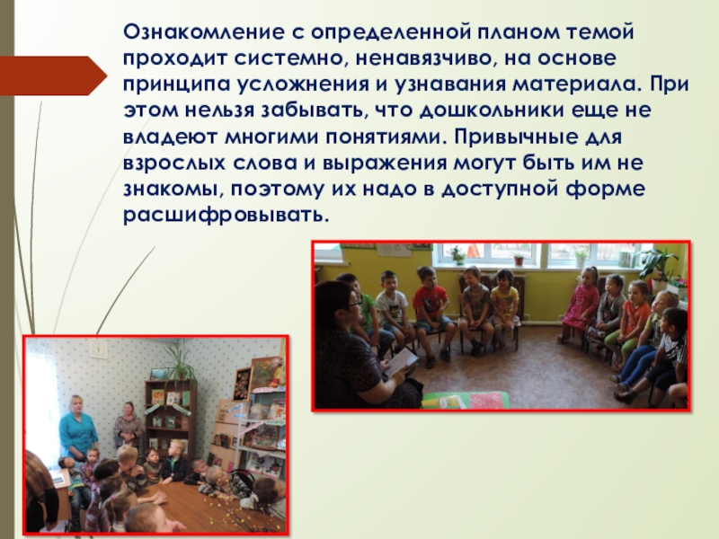Слайд 14Ознакомление с определенной планом темой проходит системно, ненавязчиво, на основе принципа