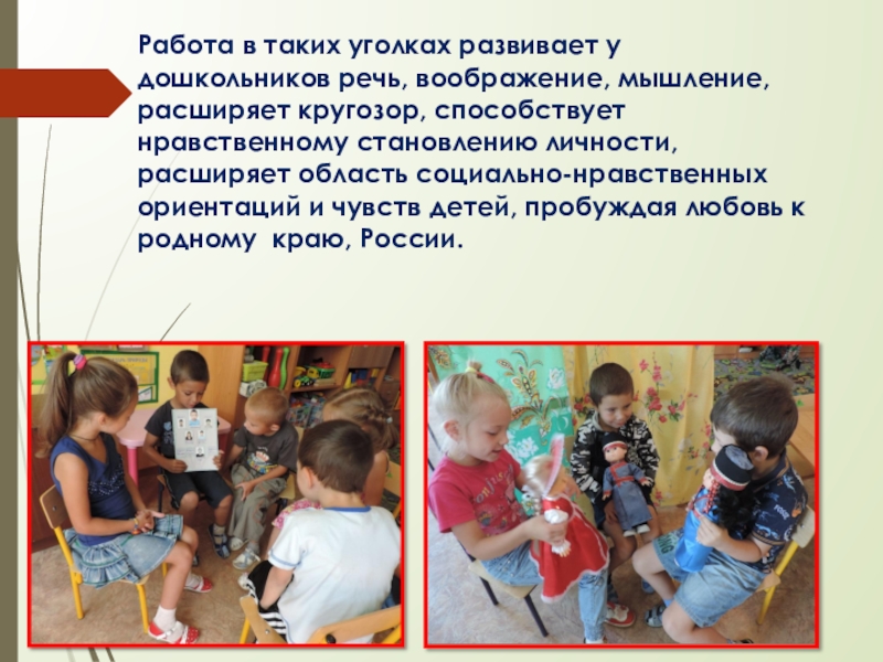 Слайд 12Работа в таких уголках развивает у дошкольников речь, воображение, мышление, расширяет