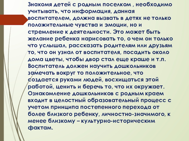Слайд 20Знакомя детей с родным поселком , необходимо учитывать, что информация, данная