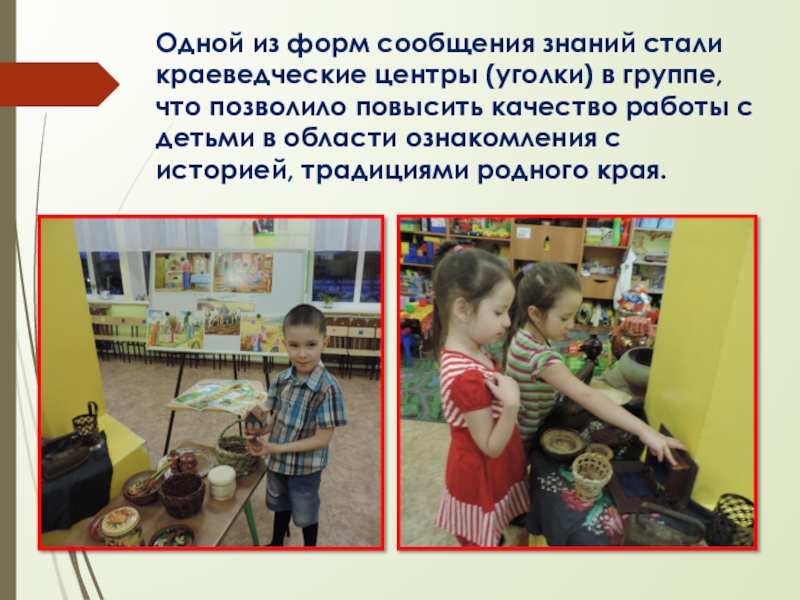 Слайд 8Одной из форм сообщения знаний стали краеведческие центры (уголки) в группе,