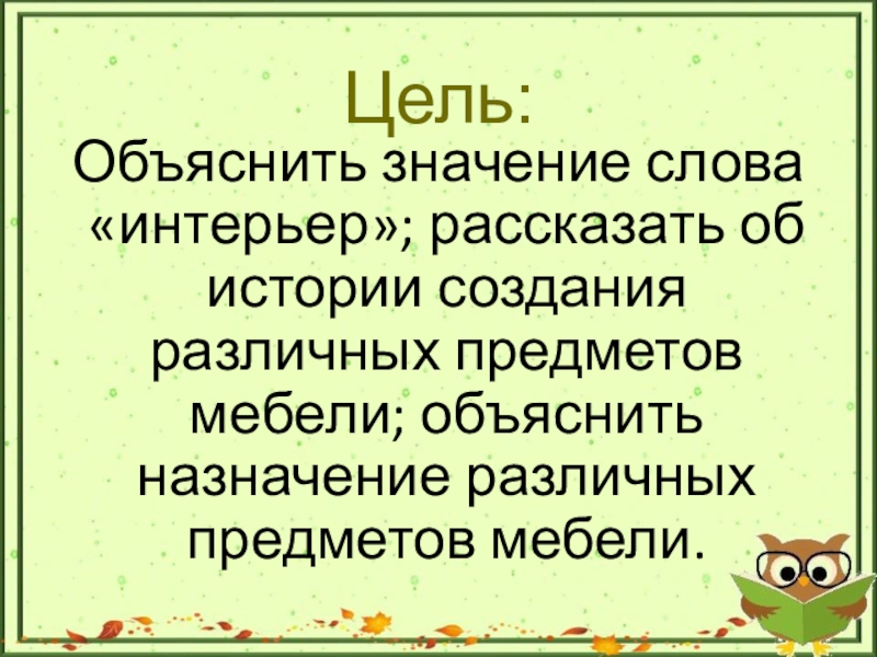 Объяснить значение слова «интерьер»; рассказать об истории создания различных предметов мебели;