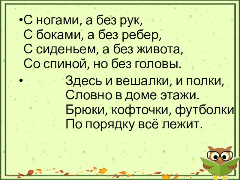 Здесь и вешалки, и полки, Словно в доме этажи. Брюки, кофточки, футболки По порядку всё лежит.