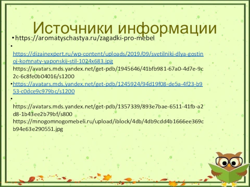 Источники информацииhttps://aromatyschastya.ru/zagadki-pro-mebel  https://dizainexpert.ru/wp-content/uploads/2019/09/svetilniki-dlya-gostinoj-komnaty-yaponskij-stil-1024x683.jpg  https://avatars.mds.yandex.net/get-pdb/1945646/41bfb981-67a0-4d7e-9c 2c-6c8fe0b04016/s1200https://avatars.mds.yandex.net/get-pdb/1245924/94d19f08-de5a-4f23-b953-c0dce9c979bc/s1200 https://avatars.mds.yandex.net/get-pdb/1357339/893e7bae-6511-41fb-a2d8-1b43ee2b79bf/s800 https://mnogomnogomebeli.ru/upload/iblock/4db/4db9cdd4b1666ee369cb94e63e290551.jpg