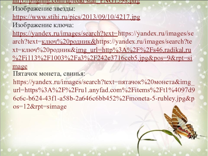 Изображение звезды: http://pngimg.com/upload/star_PNG1598.png Изображение звезды: https://www.stihi.ru/pics/2013/09/10/4217.jpg Изображение ключа: https://yandex.ru/images/search?text=https://yandex.ru/images/search?text=ключ%20родник&https://yandex.ru/images/search?text=ключ%20родник&img_url=http%3A%2F%2Fs46.radikal.ru%2Fi113%2F1003%2Fa3%2F242e3716ceb5.jpg&pos=9&rpt=simage  Пятачок монета, свинья:https://yandex.ru/images/search?text=пятачок%20монета&img_url=https%3A%2F%2Fru1.anyfad.com%2Fitems%2Ft1%4097d96c6c-b624-43f1-a58b-2a646c6bb452%2Fmoneta-5-rubley.jpg&pos=12&rpt=simage