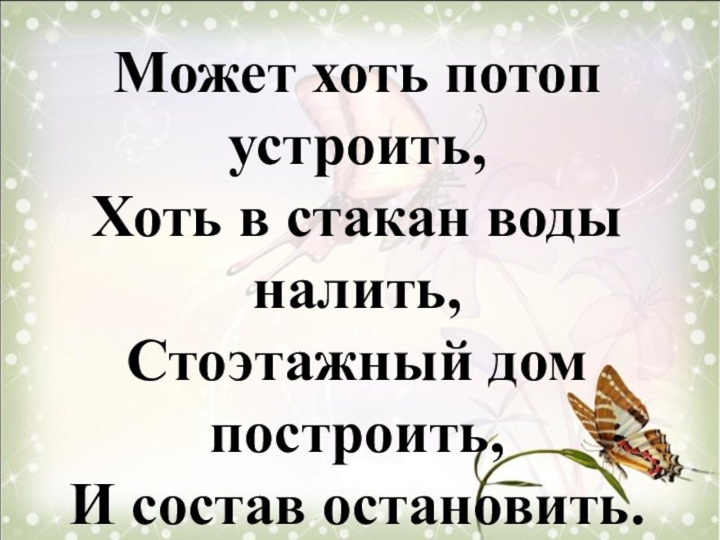 Может хоть потоп устроить,Хоть в стакан воды налить,Стоэтажный дом построить,И состав остановить.