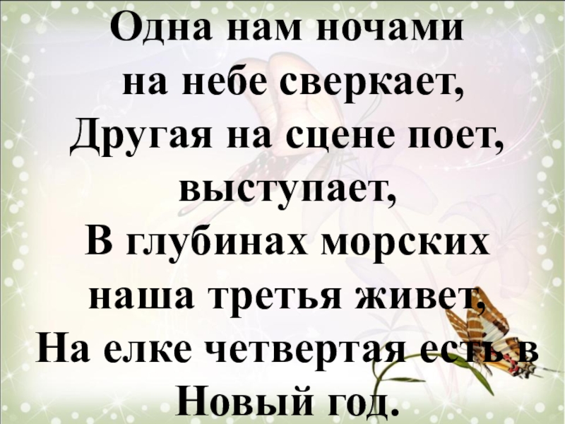 Одна нам ночами на небе сверкает,Другая на сцене поет, выступает,В глубинах морских наша третья живет,На елке четвертая