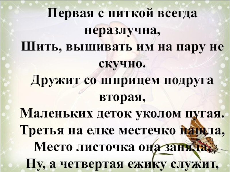 Первая с ниткой всегда неразлучна,Шить, вышивать им на пару не скучно.Дружит со шприцем подруга вторая,Маленьких деток уколом
