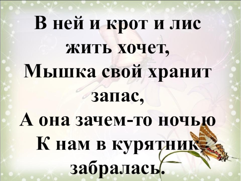 В ней и крот и лис жить хочет,Мышка свой хранит запас,А она зачем-то ночьюК нам в курятник