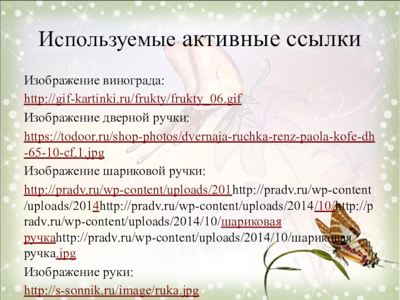 Используемые активные ссылкиИзображение винограда:http://gif-kartinki.ru/frukty/frukty_06.gifИзображение дверной ручки:https://todoor.ru/shop-photos/dvernaja-ruchka-renz-paola-kofe-dh-65-10-cf.1.jpgИзображение шариковой ручки:http://pradv.ru/wp-content/uploads/201http://pradv.ru/wp-content/uploads/2014http://pradv.ru/wp-content/uploads/2014/10/http://pradv.ru/wp-content/uploads/2014/10/шариковая ручкаhttp://pradv.ru/wp-content/uploads/2014/10/шариковая ручка.jpgИзображение руки:http://s-sonnik.ru/image/ruka.jpgИзображение листа бумаги:https://www.stihi.ru/pics/2010/12/27/7259.jpg
