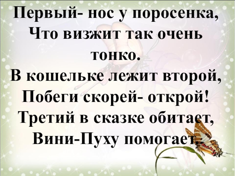 Первый- нос у поросенка,Что визжит так очень тонко.В кошельке лежит второй,Побеги скорей- открой!Третий в сказке обитает,Вини-Пуху помогает.