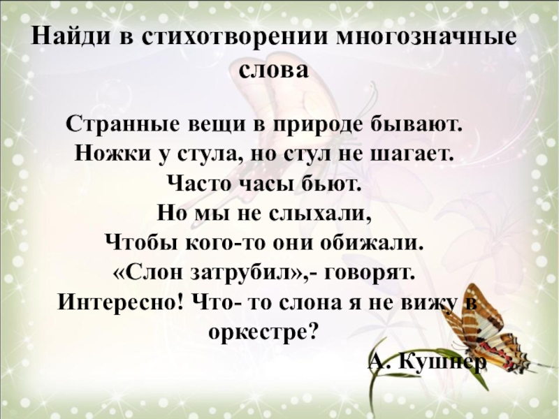 Найди в стихотворении многозначные слова   Странные вещи в природе бывают.Ножки у стула, но стул не