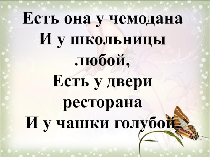 Есть она у чемоданаИ у школьницы любой,Есть у двери ресторанаИ у чашки голубой.