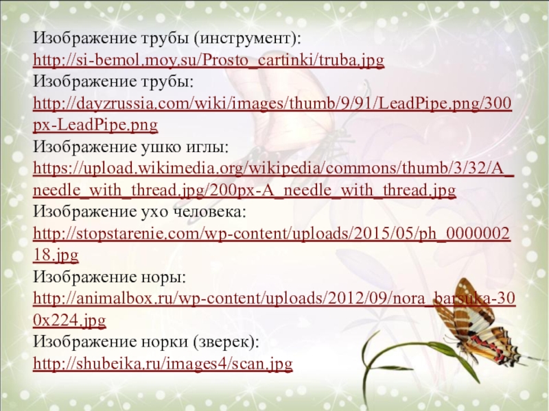 Слайд 35Изображение трубы (инструмент): http://si-bemol.moy.su/Prosto_cartinki/truba.jpg Изображение трубы: http://dayzrussia.com/wiki/images/thumb/9/91/LeadPipe.png/300px-LeadPipe.png Изображение ушко иглы: https://upload.wikimedia.org/wikipedia/commons/thumb/3/32/A_needle_with_thread.jpg/200px-A_needle_with_thread.jpg Изображение ухо человека: http://stopstarenie.com/wp-content/uploads/2015/05/ph_000000218.jpg Изображение норы: http://animalbox.ru/wp-content/uploads/2012/09/nora_barsuka-300x224.jpg Изображение норки (зверек): http://shubeika.ru/images4/scan.jpg