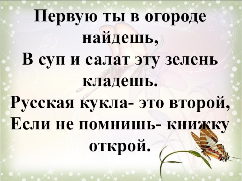 Первую ты в огороде найдешь,В суп и салат эту зелень кладешь.Русская кукла- это второй,Если не помнишь- книжку