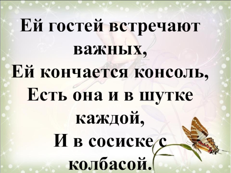 Ей гостей встречают важных,Ей кончается консоль,Есть она и в шутке каждой,И в сосиске с колбасой.
