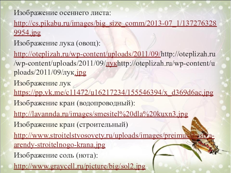 Изображение осеннего листа:http://cs.pikabu.ru/images/big_size_comm/2013-07_1/1372763289954.jpgИзображение лука (овощ):http://oteplizah.ru/wp-content/uploads/2011/09/http://oteplizah.ru/wp-content/uploads/2011/09/лукhttp://oteplizah.ru/wp-content/uploads/2011/09/лук.jpgИзображение лук https://pp.vk.me/c11472/u16217234/155546394/x_d369d6ac.jpgИзображение кран (водопроводный):http://lavannda.ru/images/smesitel%20dla%20kuxn3.jpgИзображение кран (строительный)http://www.stroitelstvosovety.ru/uploads/images/preimusshestva-arendy-stroitelnogo-krana.jpgИзображение соль (нота):http://www.graycell.ru/picture/big/sol2.jpg