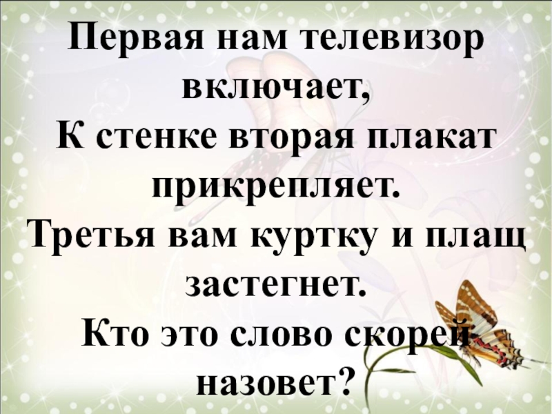 Первая нам телевизор включает,К стенке вторая плакат прикрепляет.Третья вам куртку и плащ застегнет.Кто это слово скорей назовет?