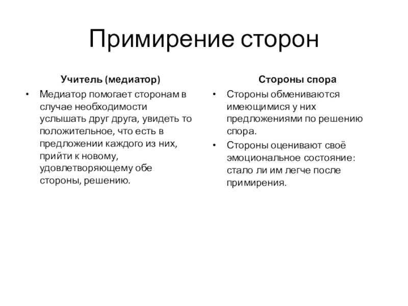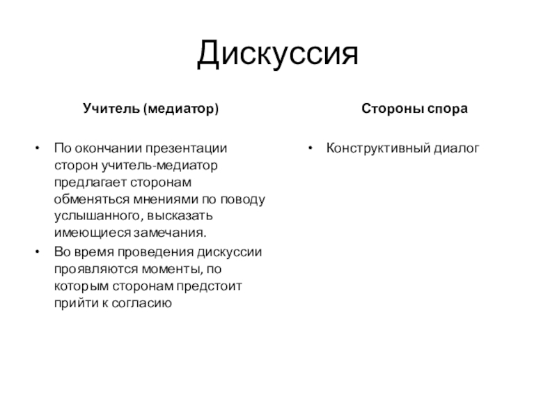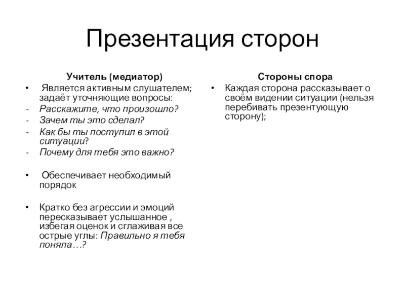 Каждая сторона рассказывает о своём видении ситуации (нельзя перебивать презентующую сторону);