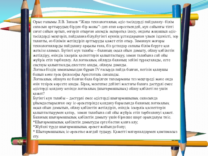 Слайд 5Орыс ғалымы Л.В. Занков “Жаңа технологиялық әдіс-тәсілдерді пайдалану- білім сапасын арттырудың