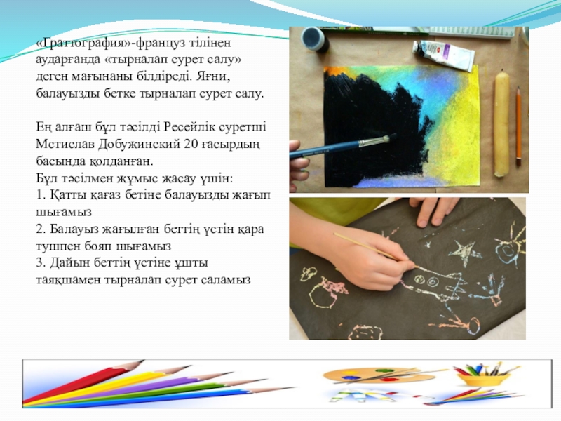 «Граттография»-француз тілінен аударғанда «тырналап сурет салу» деген мағынаны білдіреді. Яғни, балауызды
