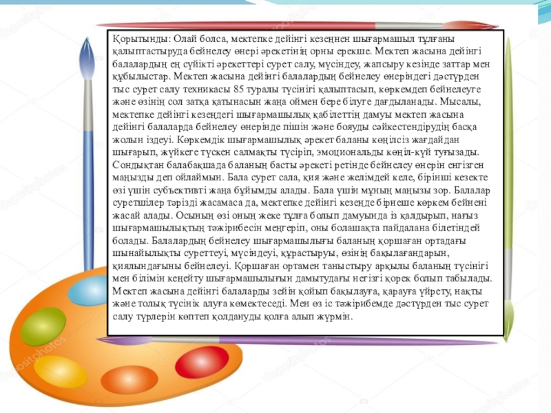Слайд 16Қорытынды: Олай болса, мектепке дейінгі кезеңнен шығармашыл тұлғаны қалыптастыруда бейнелеу өнері